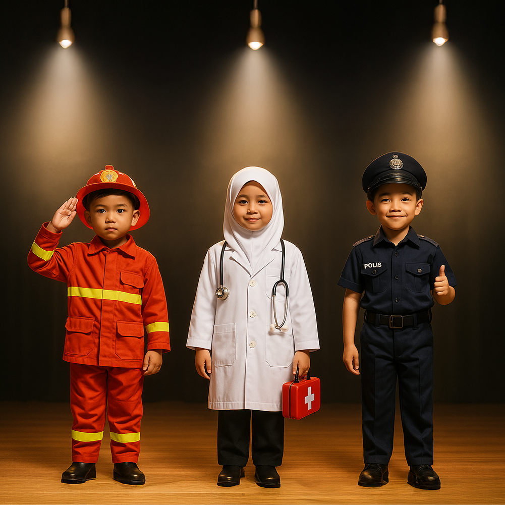 • Peserta boleh membawa props ringkas (contoh stetoskop, walkie-talkie, helmet keselamatan).