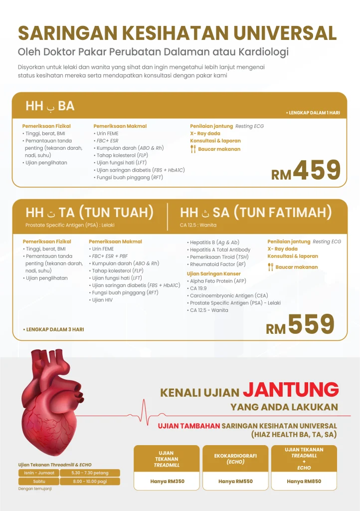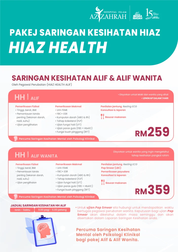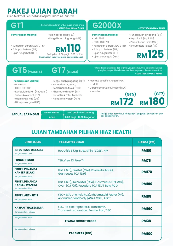 Di HIAZ, kami menyediakan tiga jenis saringan kesihatan utama iaitu; ujian darah, saringan kesihatan dan saringan kesihatan universal. Terdapat beberapa pilihan pakej bagi setiap jenis saringan kesihatan seperti yang tertera. Tarikh effektif: 01 Januari – 31 Disember 2025