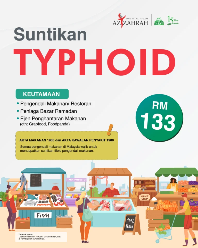 Menurut Akta Makanan 1983 & Akta Kawalan Penyakit 1988, semua individu yang bekerja dalam sektor makanan wajib mendapatkan Suntikan Typhoid bagi mencegah penyebaran penyakit tifoid.