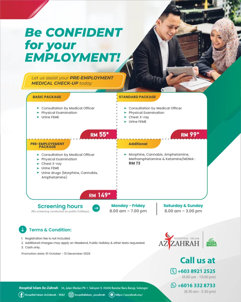 Di Hospital Islam Az-Zahrah, kami menyediakan tiga pakej pemeriksaan pra-pekerjaan mengikut keperluan syarikat dan individu. Di antaranya adalah pakej asas, pakej standard, dan pakej pra-pekerjaan. Pihak syarikat boleh menghubungi Pegawai Pemasaran kami jika memerlukan lain-lain ujian bagi pemeriksaan ini.